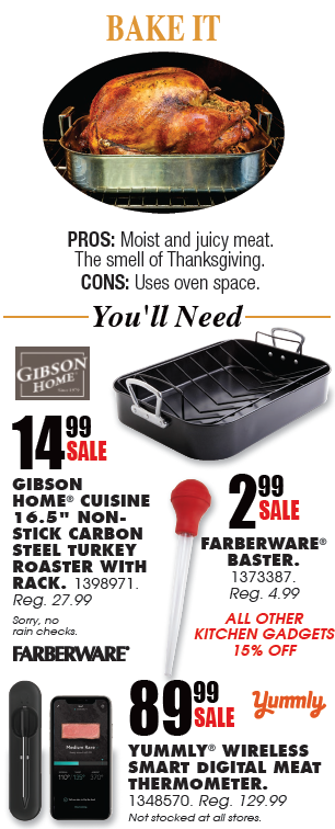 Pros: Low maintenance and speedy cooking time – about one hour for a 16-lb. bird.