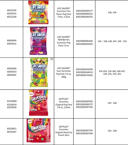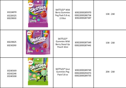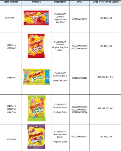 These products were manufactured by a third-party . The products subject to this recall include specific varieties of SKITTLES® Gummies, STARBURST® Gummies, and LIFE SAVERS® Gummies are described in the table below. On the back of the package is a 10-digit manufacturing code; the first three digits in this code will indicate implicated product.