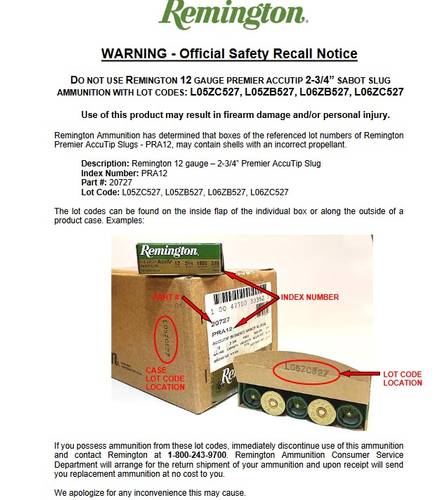 Remington Ammunition has determined that boxes of the referenced lot numbers of Remington Premier AccuTip Slugs - PRA12, may contain shells with an incorrect propellant.