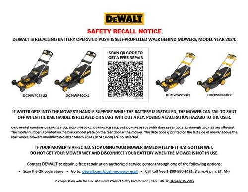 DEWALT IS RECALLING BATTERY OPERATED PUSH & SELF-PROPELLED WALK BEHIND MOWERS, MODEL YEAR 2024